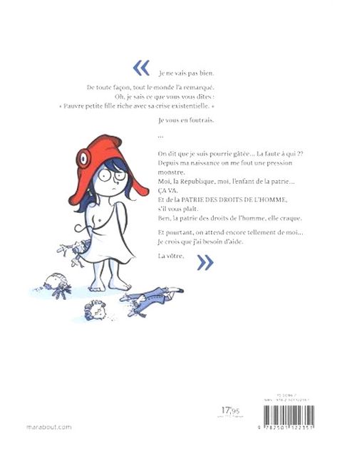 Cet album traite de la dépression qui touche la France, mal en point, relatée « en direct » sous la forme du journal intime de Marianne. Le récit commence le 21 septembre 2015. C'est l'anniversaire de Marianne. Evidemment, tout le monde l'a oublié. Elle déprime. Marianne a 223 ans mais ne les fait pas ! Pour une jeune femme, elle se sent si vieille... Ses insomnies sont de plus en plus fréquentes. Les événements de janvier 2015 occupent ses pensées, elle n'arrive pas à passer à autre chose. Comment se relever ? Hantée par ses angoisses, elle ne tient plus. Marianne commente son actualité, relate et vit les grands événements de 2015-2016 : débat sur la déchéance de nationalité, attentats, brexit, montée du FN, régionales, crise des migrants, etc. Elle commente, s'énerve, se trompe... Ce livre est une déclaration d'amour à Marianne et une mise en garde sur le fait qu'elle n'est pas immortelle.