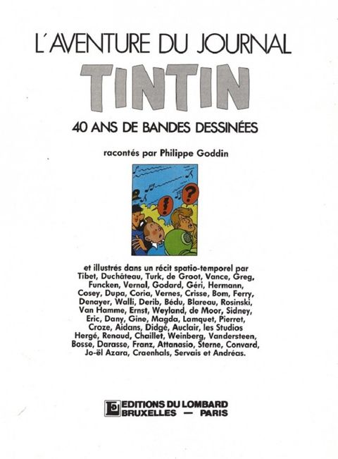 40 ans du journal "Tintin" - 1946 à 1986- racontés par Philippe Godin & illustrés par divers dessinateurs : 23 portraits d'humeur et illustrés dans un récit spatio-temporel de 60 planches en couleurs + textes. l'album fait 104 pages