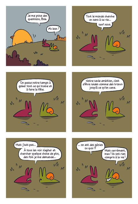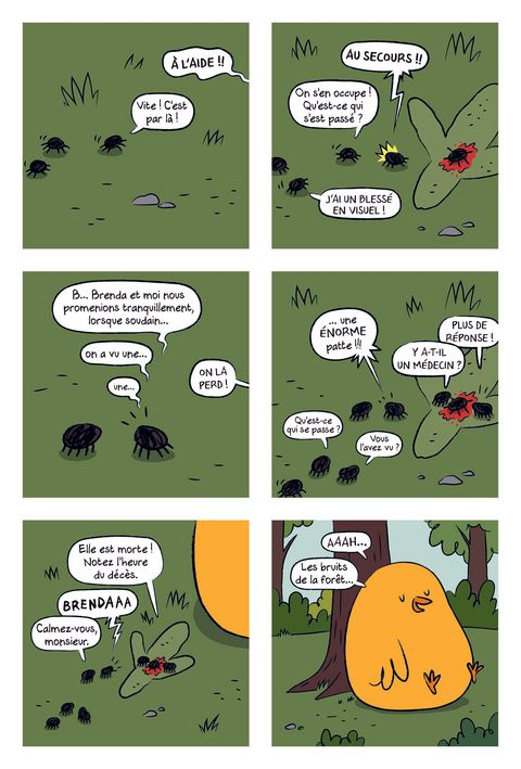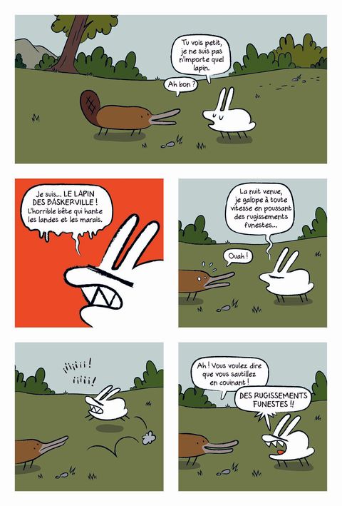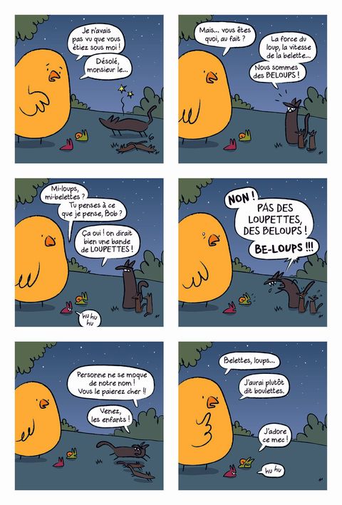 Le bestiaire, familier, est aussi unique en son genre : un lapin convaincu de faire régner la terreur, un duo d'escargots et de limaces toxicos, un poussin de 500 kilos qui ne connait pas sa force (ni son poids), une famille de Beloups (mi-belette, mi-loup) persuadée d'être les prédateurs ultimes, un ornithorynque naïf... qui font de ce décor de comptine un récit irrésistiblement et cruellement drôle.