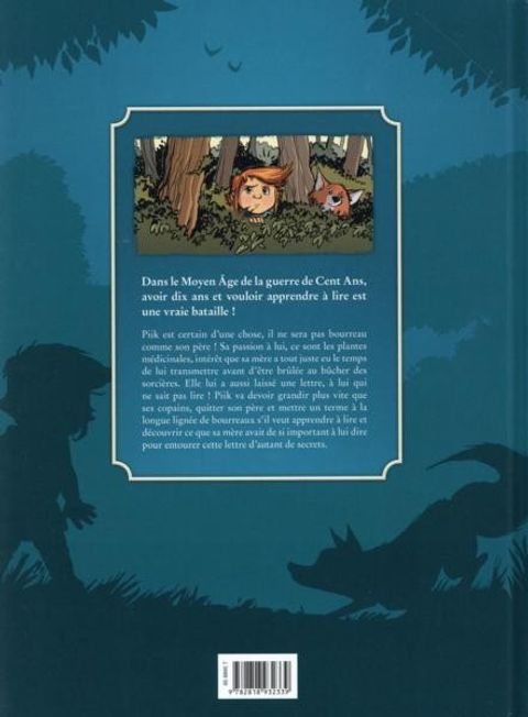 Piik est certain d'une chose, il ne sera pas bourreau comme son père ! Sa passion à lui, ce sont les plantes médicinales, intérêt que sa mère a tout juste eu le temps de lui transmettre avant d'être brûlée au bûcher des sorcières. Elle lui a aussi laissé une lettre, à lui qui ne sait pas lire ! Piik va devoir grandir plus vite que ses copains, quitter son père et mettre un terme à la longue lignée de bourreaux s'il veut apprendre à lire et découvrir ce que sa mère avait de si important à lui dire pour entourer cette lettre d'autant de secrets...