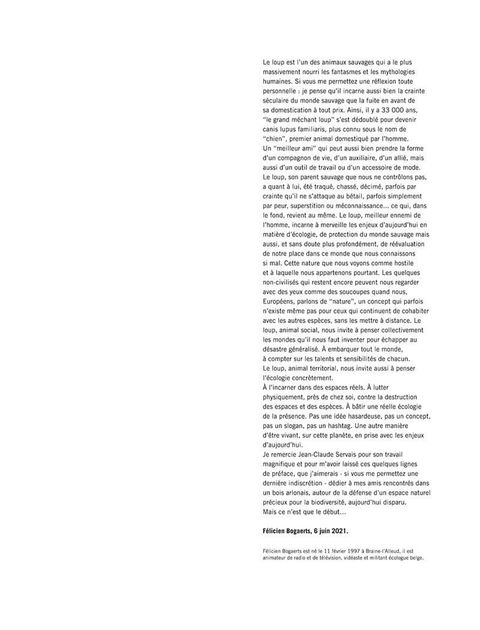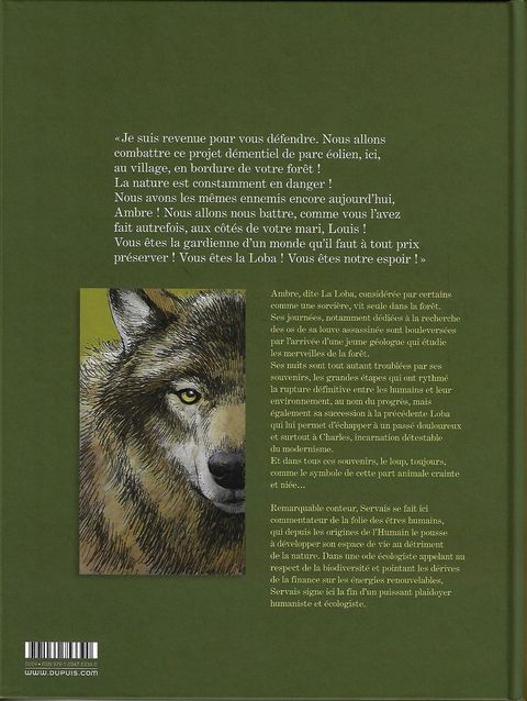 Ambre, dite «La Loba», et que certains considèrent comme une vieille sorcière, vit seule dans la forêt. Son objectif: retrouver les os de son loup assassiné, qu'elle espère ressusciter grâce à d'antiques secrets... Mais l'arrivée dans sa montagne d'une jeune chercheuse vient troubler l'équilibre de sa vie diurne. Sa vie nocturne, elle, est comme toujours rythmée par ses souvenirs. Ambre se rappelle ainsi comme elle succéda à la précédente «Loba», échappant à un déséquilibre entre l'Homme et la Nature, incarnée par Charles, son ami d'enfance, détestable chantre du «modernisme»... Elle se rappelle aussi les grandes étapes qui rythmèrent la rupture définitive entre les humains et leur environnement, au nom du «progrès». Et dans tous ces souvenirs, le loup, toujours, comme le symbole de cette part animal crainte et niée... Toujours plus beau, toujours plus habité: la fin d'un puissant plaidoyer humaniste et écologiste signé Servais.