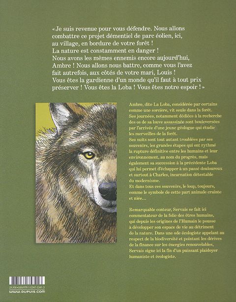 Ambre, dite «La Loba», et que certains considèrent comme une vieille sorcière, vit seule dans la forêt. Son objectif: retrouver les os de son loup assassiné, qu'elle espère ressusciter grâce à d'antiques secrets... Mais l'arrivée dans sa montagne d'une jeune chercheuse vient troubler l'équilibre de sa vie diurne. Sa vie nocturne, elle, est comme toujours rythmée par ses souvenirs. Ambre se rappelle ainsi comme elle succéda à la précédente «Loba», échappant à un déséquilibre entre l'Homme et la Nature, incarnée par Charles, son ami d'enfance, détestable chantre du «modernisme»... Elle se rappelle aussi les grandes étapes qui rythmèrent la rupture définitive entre les humains et leur environnement, au nom du «progrès». Et dans tous ces souvenirs, le loup, toujours, comme le symbole de cette part animal crainte et niée... Toujours plus beau, toujours plus habité: la fin d'un puissant plaidoyer humaniste et écologiste signé Servais.