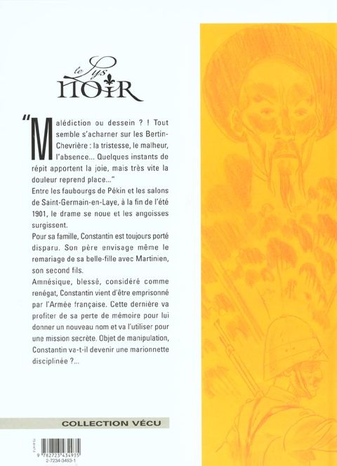 Entre les faubourgs de Pékin et les salons de St-Germain-en-Laye, à la fin de l'été 1901, le drame se noue, et les angoisses surgissent... Malgré les recherches de Joseph à Pekin, Constantin est toujours porté disparu. Sa femme Inès le croit mort. A la demande de son beau-père et pour que son fils ne soit pas orphelin, elle consent à épouser Martinien, son beau-frère, qui s'apprête à reprendre la gestion des entreprises familiales. Alors que Joseph croit retrouver Constantin, il est rappelé à St-Germain-en-Laye où une autre mission l'attend. Mais il arrive trop tard, en plein mariage d'Inès et Martinien. « Malédiction ou dessein ? ! Tout semble s'acharner sur les Bertin-Chevrière ; la tristesse, le malheur, l'absence... Quelques instants de répit apportent la joie, mais très vite la douleur reprend place... » Pourtant, Constantin, toujours bel et bien vivant même s'il est blessé et amnésique, vient d'être emprisonné par les siens, considéré comme un renégat. Il est rapatrié, incarcéré, en attendant de passer en cour martiale. L'armée profite de sa perte de mémoire pour le rebaptiser Constantin Detaille et va le l'utiliser pour une mission secrète. Objet de manipulation, Constantin va-t-il devenir une marionette disiplinée... ?