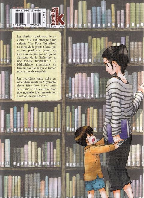 Les destins continuent de se croiser à la bibliothèque pour enfants «La Rose Trémière». La mère de la petite Chris, qui se sent perdue au Japon, va être bouleversée par un grand classique de la littérature et une femme travaillant à la bibliothèque municipale va faire une annonce qui va laisser tout le monde stupéfait. Un neuvième tome riche en rebondissements où Miyamoto devra faire face à ses amis sans pitié et où les livres font une nouvelle fois ressortir les émotions les plus fortes !