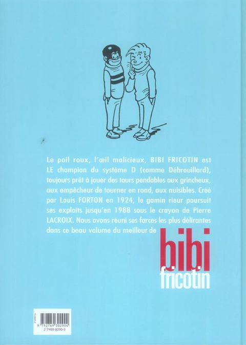 Bibi Fricotin est un jeune garçon débordant de vitalité. Joyeux farceur au regard espiègle, il parcourt le monde et vit de formidables aventures, entouré de ses inséparables amis, Razibus Zouzou et le Professeur Radar. Endossant bien volontiers le rôle de redresseur de torts, il invente à profusion mille astuces pour venir en aide à ceux qui le demande et épingle avec malice les pauvres bougres qui croisent son chemin ! Avec le sourire, il oppose l'intelligence à la bêtise et l'ingéniosité à la force. Personnage né en 1924 de la plume de Louis Forton, il fut ensuite repris par Callaud avant de trouver son apogée sous le talent de Pierre Lacroix, à partir de 1947.
