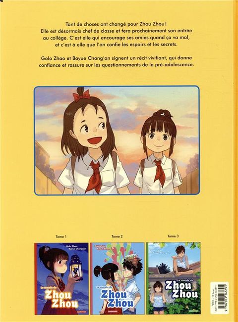 Zhou Zhou Yu entre en CM2. Devenue cheffe de classe, très bonne élève, elle sait prendre les bonnes décisions et soutenir ses meilleures amies. Secrètement, Zhou Zhou pense toujours au beau Yang Lin, auquel elle n’a pas parlé depuis plusieurs années… Mais pas sûr qu’elle sache très bien s’y prendre pour lui montrer qu’il lui plait ! Un tome 4 tout en sensibilité, dans lequel Golo Zhao s’attache à décrire le début de la pré-adolescence (les amourettes, les copines, le corps qui change, etc).
