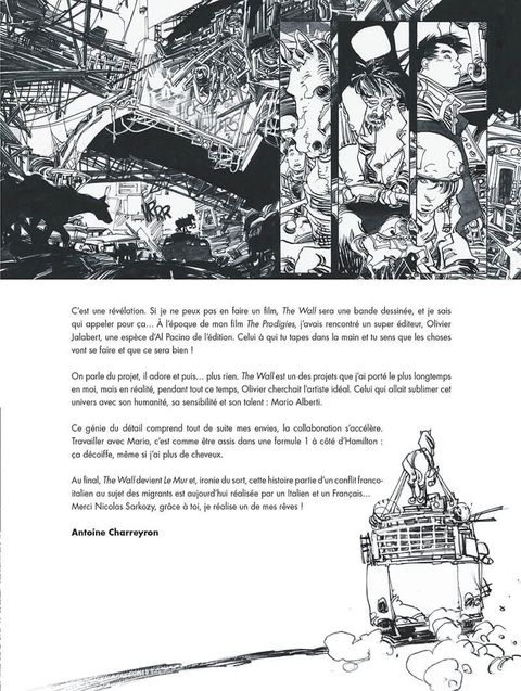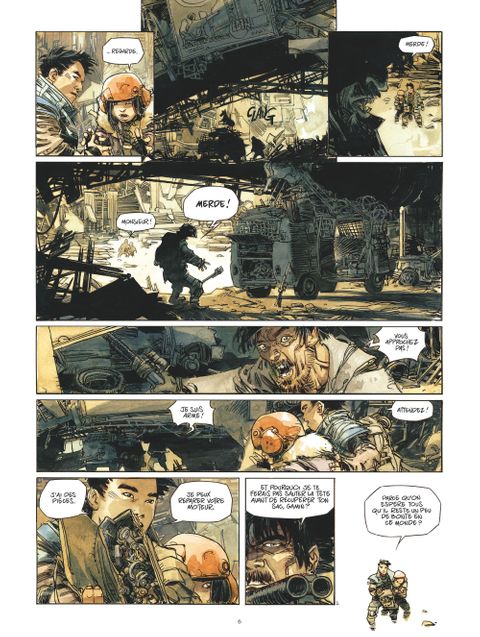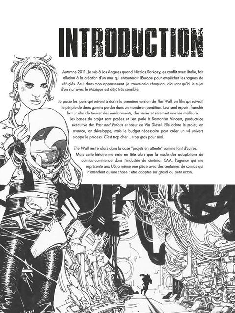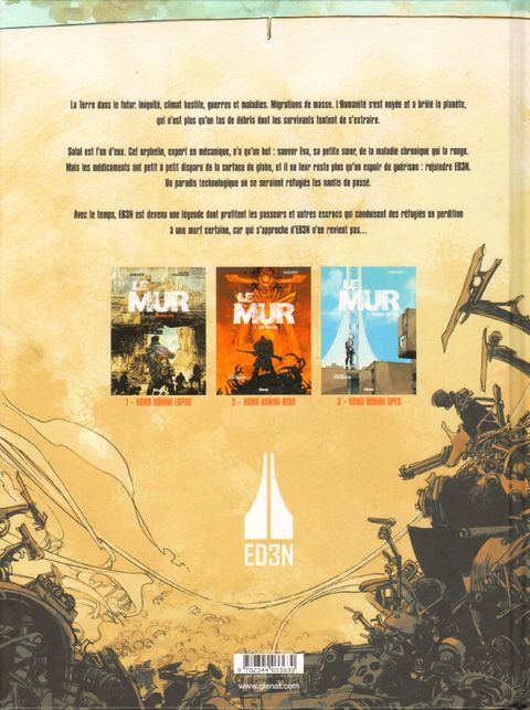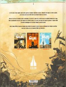 Le meilleur moyen de se protéger est encore de cacher la vérité.Dans un futur post-apocalyptique, le monde n'est que ruines et désolation. La civilisation n'est plus et l'humanité vit de pillages et de bidouille, s'organisant en villages de fortune ou en caravanes d'épaves vrombissantes où la brutalité fait société. Dans cet enfer, Solal, jeune et habile réparateur, fait ce qu'il peut pour protéger sa soeur Eva atteinte d'une grave maladie respiratoire. Mais alors que leur réserve de médicaments s'épuise, ils n'ont plus qu'un seul espoir : se rendre au « Mur », une gigantesque enceinte imprenable et gardée par de monstrueux robots. À l'abri y vivrait une communauté de gens puissants, protégée du reste du monde, avec toutes les ressources nécessaires à leur survie... Mais qui sait ce qui se cache véritablement à l'intérieur ?Entre la radicalité de Mad Max et le nihilisme de The Walking Dead, Le Mur nous plonge dans un maelstrom de poussière, de rouille et de sang. Une prouesse graphique pour un road movie sauvage et post-apocalyptique qui, dans la plus pure tradition du genre, nous interroge sur le devenir de l'humanité et les conséquences de nos actes.