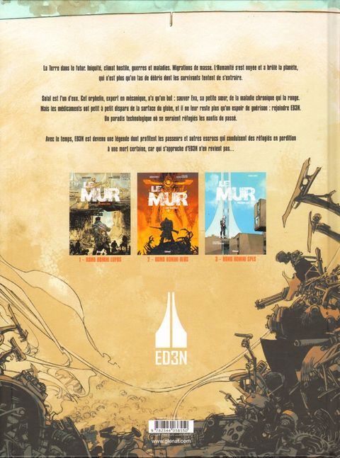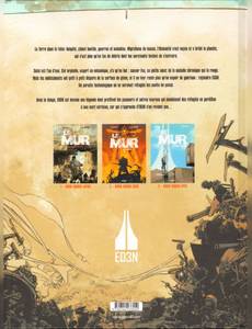 Les fondements du Mur. Solal a réussi à pénétrer dans l'enceinte du Mur et va enfin pouvoir trouver les médicaments dont sa soeur a besoin. Mais ce supposé paradis terrestre n'est que chimère. Il n'est qu'une prison à ciel ouvert de plus... Pire ! N'y vivent que des " sans vies ", âmes perdues se nourrissant de la chaleur des corps vivants. Comment ces hommes et ces femmes se sont-ils transformés en ces monstres hagards ? Qui est l'architecte de cette ignoble frontière ? Réponse dans ce second tome haletant qui revient en partie sur l'origine du Mur et de son fondateur : Noah. Entre la radicalité de Mad Max et le nihilisme de The Walking Dead, Le Mur nous plonge dans un maelstrom de poussière, de rouille et de sang. Une prouesse graphique pour un road movie sauvage et post-apocalyptique qui, dans la plus pure tradition du genre, nous interroge sur le devenir de l'humanité et les conséquences de nos actes.