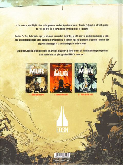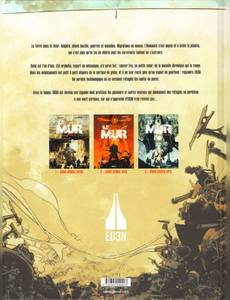 L'effondrement.À la naissance de Jen, ses jambes ne fonctionnent pas. Son père, grand penseur du projet Eden, parvient des années après le lancement de sa cité emmurée à trouver un moyen de sauver sa fille: un orbe à la technologie révolutionnaire qu'il faut placer au niveau du coeur. L'appareil a notamment la faculté d'aspirer de manière autonome les ressources nécessaires à la survie de son porteur. Mais quand Jen et son frère Janus se le font implanter, l'outil est mal réglé. Si mal, qu'il pousse ses hôtes à se nourrir de la vie des êtres alentours. Une fois l'énergie de ces êtres consommée, ces derniers ne meurent pas tout à fait. L'orbe a fusionné en eux, ils en deviennent les esclaves insatiables et cherchent à leur tour une source d'énergie afin de contenter son appétit. C'est ainsi, en se démultipliant, que l'orbe a contaminé Eden, transformant ce lieu de privilèges en cimetière latent. Mais les choses sont sur le point de changer. Le gardien des lieux, l'impitoyable drone Cerberus vient de passer en mode automatique. Tout objet mouvant est dorénavant une cible et seul le courage, l'inconscience et le sacrifice sauront annihiler cette machine à la force de frappe destructrice. Solal, Eva, Jen, Janus, le groupe B.A.S.T.A.R.D.S et Chandra, ils auront tous un rôle à jouer dans le baroud d'honneur de cet ancien paradis devenu enfer.Dernier tome frénétique et étourdissant pour Le Mur qui, entre la radicalité deMad Maxet le nihilisme deThe Walking Dead,parvient une nouvelle fois à nous plonger dans un maelstrom de poussière, de rouille et de sang. Une prouesse graphique pour unroad moviesauvage et post-apocalyptique qui, dans la plus pure tradition du genre, nous interroge sur le devenir de l'humanité et les conséquences de nos actes.