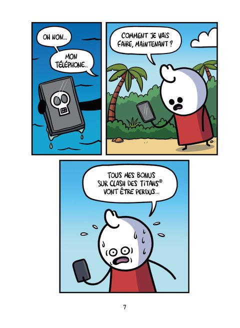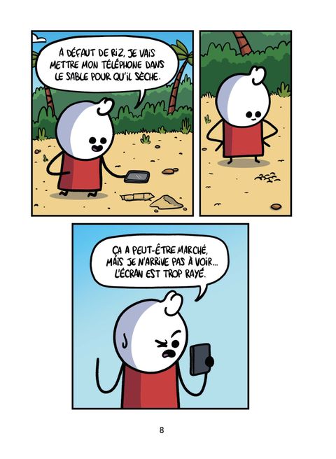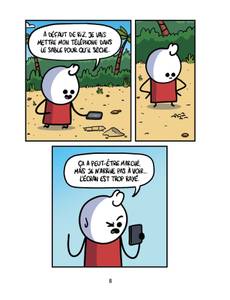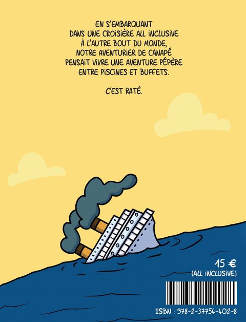 En s'embarquant dans une croisière all inclusive à l'autre bout du monde, notre aventurier de canapé pensait vivre des vacances pépère entre piscines et buffets. Mais, après avoir provoqué le naufrage du bateau, il s'échoue seul sur une île déserte et se retrouve alors confronté à l'un des plus grands défis de l'homme moderne, vivre sans téléphone ! Obligé de s'initier à la vie sauvage, il prend ses marques : noix de coco au petit-déjeuner, noix de coco au déjeuner, noix de coco au souper. Très vite, des évènements étranges surviennent : de vils pirates assoiffés d'or et de followers, une poule à l'agressivité vengeresse... Hélas, il se trouve qu'il n'est pas aussi doué que Robinson et il ne parvient pas à trouver son Vendredi (avec une notion du temps aussi floue que ses selfies, c'était prévisible). Bien sûr, ce livre étant une parodie de Robinson Crusoé, tout le monde se demande s'il va niquer un arbre ou pas. Achetez le livre et vous saurez.