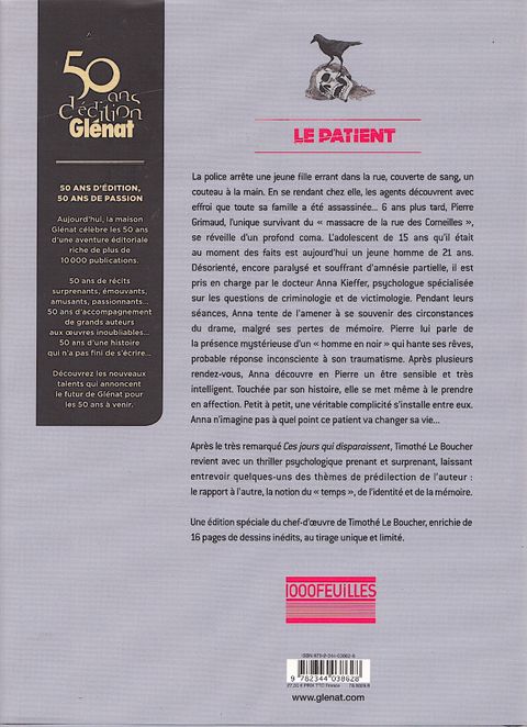 À quoi bon se souvenir qu'on a vécu l'enfer ?La police arrête une jeune fille errant dans la rue, couverte de sang, un couteau à la main. En se rendant chez elle, les agents découvrent avec effroi une scène de massacre : toute sa famille a été assassinée... 6 ans plus tard, Pierre Grimaud, l'unique survivant du « massacre de la rue des Corneilles », se réveille d'un profond coma. L'adolescent de 15 ans qu'il était au moment des faits est aujourd'hui un jeune homme de 21 ans. Désorienté, encore paralysé et souffrant d'amnésie partielle, il est pris en charge par le docteur Anna Kieffer, psychologue spécialisée sur les questions de criminologie et de victimologie. Pendant leurs séances, Anna tente de l'amener à se souvenir des circonstances du drame, malgré ses pertes de mémoire. Pierre lui évoque la présence mystérieuse d'un « homme en noir » qui hante ses rêves, probable réponse inconsciente à son traumatisme. Après plusieurs rendez-vous, Anna découvre en Pierre un être sensible et très intelligent. Touchée par son histoire, elle se met même à le prendre en affection. Petit à petit, une véritable complicité s'installe entre eux. Anna n'imagine pas à quel point ce patient va changer sa vie...Après le remarqué Ces jours qui disparaissent, Thimothé Le Boucher revient avec un ouvrage témoignant une nouvelle fois de sa science narrative exemplaire. S'inscrivant dans une veine plus réaliste, Le Patient est un thriller psychologique prenant et surprenant, laissant entrevoir quelques-uns des thèmes de prédilection de l'auteur : le rapport à l'autre, la notion du « temps », de l'identité et de la mémoire.