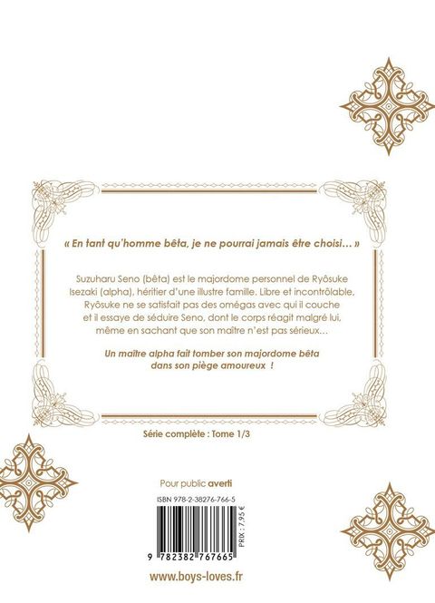 " En tant qu'homme bêta, je ne pourrai jamais être choisi... " Suzuharu Seno (bêta) est le majordome personnel de Ryôsuke Isezaki (alpha), héritier d'une illustre famille. Libre et incontrôlable, Ryôsuke ne se satisfait pas des omégas avec qui il couche et il essaye de séduire Seno, dont le corps réagit malgré lui, même en sachant que son maître n'est pas sérieux...Un maître alpha fait tomber son majordome bêta dans son piège amoureux !
