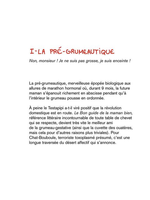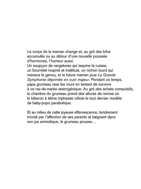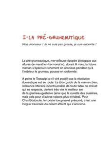 Les tribulations quotidiennes d'une maman et de son grumeau en plusieurs étapes : La pré-grumeautique (ou grossesse) : Angoisses et questionnements, préparation à l'accouchement, le corps qui se transforme, les humeurs changeantes... et le moment fatidique ! Un grumeau, ça change la vie ! Vie de couple, biberons, petits pots et couches sales... Les nouveaux sujets de conversation pipi-caca, les amis qui vous évitent... Mais aussi le grumeau-chaos, ou comment dompter la marmaille déchaînée ; et la grumeau-sociologie, ou l'art d'ignorer royalement les bons conseils, etc.