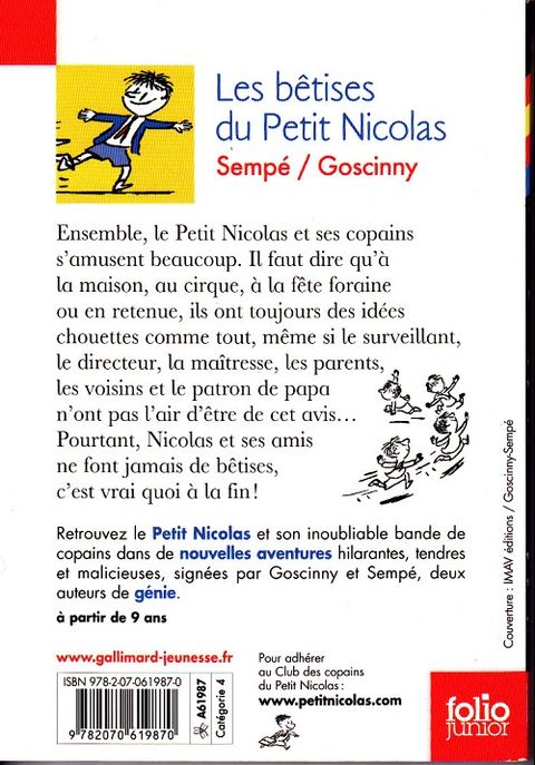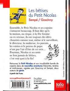 Ensemble, le Petit Nicolas et ses copains s'amusent beaucoup. Il faut dire qu'à la maison, au cirque, à la fête foraine ou en retenue, ils ont toujours des idées chouettes comme tout, même si le surveillant, le directeur, la maîtresse, les parents, les voisins et le patron de papa n'ont pas l'air d'être de cet avis... Pourtant, Nicolas et ses amis ne font jamais de bêtises, c'est vrai quoi à la fin ! « Nicolas est de retour pour nous raconter de nouveaux épisodes de sa vie agitée de petit garçon actif. Il est entouré non seulement de Joachim, un copain, mais de tous les autres : Alceste, le gros qui mange tout le temps des choses, Eudes, qui aime bien donner des coups de poing sur le nez des copains, Rufus, qui a un papa agent de police qui lui cède ses vieux sifflets à roulette, Maixent, qui a des jambes très longues avec de gros genoux sales, Clotaire, qui est le dernier de la classe, mais qui a un vélo et Agnan, le chouchou. Ils sont tous là, amis fidèles et éprouvés, avec lesquels on peut se battre sans arrière-pensée, tout en se jurant presque quotidiennement de ne plus se parler de toute la vie. » Texte de présentation de René Goscinny.