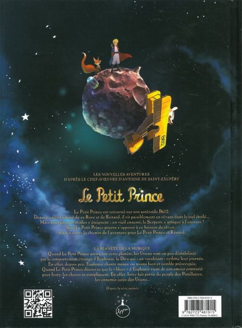 Le Petit Prince est retourné sur son astéroïde B612. Depuis, entre l'amitié de sa Rose et de Renard, il vit paisiblement en rêvant dans le ciel étoilé... Mais voici que des étoiles s'éteignent ; un vieil ennemi, le Serpent, s'attaque à l'univers ! Seul Le Petit prince pourra s opposer a ce briseur de rêves... Ainsi s'ouvre le chemin de l'aventure pour Le Petit Prince et Renard. La planète de la musique. Quand Le Petit Prince arrive sur cette planète. les Utiens sont un peu déstabilisés par le comportement étrange d'Euphonie. La Diva qui - en vocalisant - rythme leur journée. En effet. depuis peu, Euphonie chante moins, ou moins bien et semble préoccupée. Quand Le Petit Prince découvre que le "blues" d'Euphonie vient de son amour contrarié pour Ivory, les choses se compliquent. En effet, Ivory fait partie du peuple des Pistillaires, les ennemis jurés des Utiens...