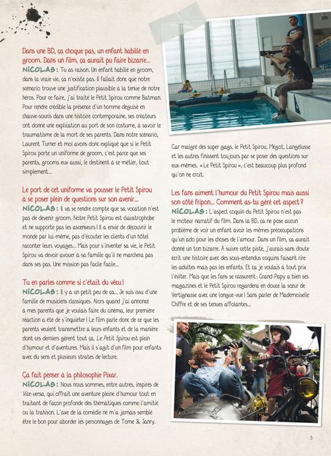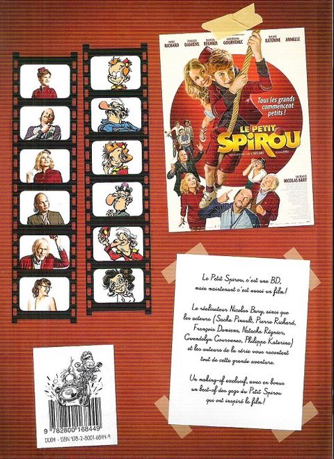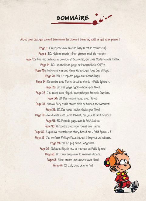 Ça y est, le Petit Spirou fait son cinéma ! À l'occasion de la sortie en salle du film Le Petit Spirou, adaptation par Nicolas Bary de la série culte de Tome et Janry, notre incorrigible héros en culottes courtes - rouges, cela va de soi - vous propose de découvrir ou de redécouvrir son univers grâce à cet album spécial. Au programme : dictée de rires, révisions ludiques des personnages et exposé oral sur les acteurs du projet, avec plein d'anecdotes et d'infos sur la conception du film, depuis les coulisses de la réalisation jusqu'au rendu final derrière la caméra. Dans une maquette originale aux senteurs de l'enfance, fidèle au caractère espiègle de son protagoniste, cette compilation enrichie revient sur quelques-uns des gags les plus drôles et les plus célèbres de la série. Et en dix-huit albums et plus de vingt-cinq ans d'existence, il y en a eu des blagues, des bêtises et de l'émotion ! Alors, pour ceux qui ont vu le film sans connaître la BD, pour ceux qui ont lu la BD sans voir le film, pour ceux qui projettent d'y aller, bref, pour tout le monde, enfants, parents et grands enfants, lancez-vous ! Après tout, nous avons tous en nous quelque chose du Petit Spirou !