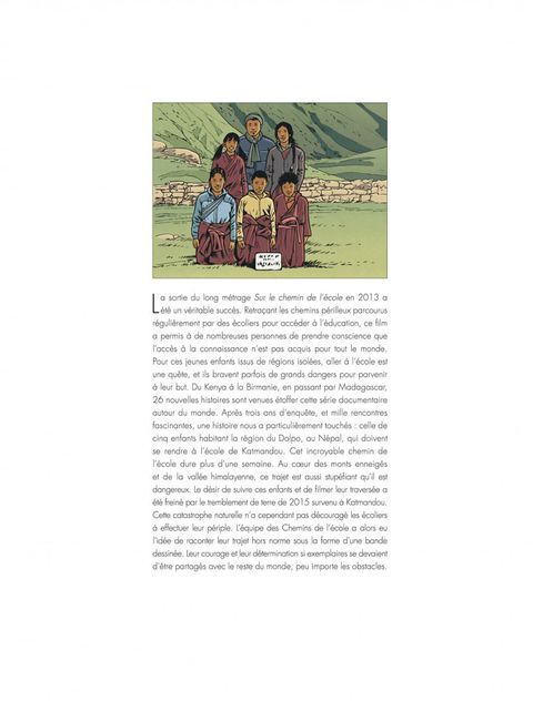 C'est la rentrée des classes, 8 enfants quittent leur village pour rentrer au collège. Mais leur école est à Katmandou et pour s'y rendre, ils doivent marcher pendant 6 jours au coeur de l'Himalaya, dormir en pleine nature, et vivre des aventures incroyables. Cette fantastique histoire vraie est racontée par la scénariste du film et de la série « Sur les chemins de l'école » et dessinée par Renaud Garreta.