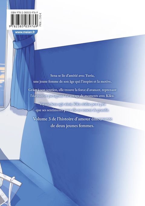 Sena se lie d'amitié avec Yuria, une jeune femme de son âge qui l'inspire et la motive.Grâce à son soutien, elle trouve la force d'avancer, reprenant l'écriture et partageant davantage de moments avec Kiku.Voyant Sena agir ainsi, Kiku réalise peu à peu que ses sentiments pour elle ne cessent de grandir.Le 3e volume de cette histoire d'amour émouvante entre deux jeunes femmes.