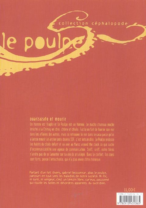 Un homme est fragile et le Poulpe est un homme le macho chameau moche éméché à la Chimay en chie, chôme et chiale. Facile en fait de fourrer son nez dans les affaires des autres, mais se retrouver le nez dans le caca parce qu'on a laissé mourir un ancien pote devenu Sur, c'est intolérable. Le Poulpe endosse les habits du clodo défunt et va voir au Maroc around the dock ce que cache d'incommunicabilité une agence de communication. Sniff, sniff, notre héros n'arrête pas de se lamenter sur sa vie de privilégié. Dans le confort, les cons sont forts, pense l'intouchable, qui n'a plus envie d'être héroïque. Partant d'un fait divers, Gabriel Lecouvreur, alias le poulpe, parcourt en tout sens les maladies de notre société. Ni flic, ni curé, ni vengeur, c'est un témoin libre, curieux, passionné qui fouille les failles et désordres apparents du quotidien.