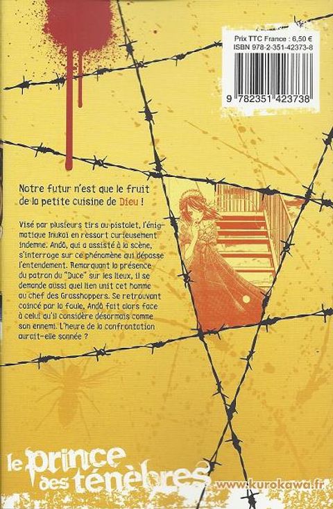Visé par plusieurs tirs au pistolet, l'énigmatique INUKAÏ en ressort curieusement indemne. ANDÔ, qui a assisté à la scène, s'interroge sur ce phénomène qui dépasse l'entendement. Remarquant la présence du patron du "Duce" sur les lieux, il se demande aussi quel lien unit cet homme au chef des Grasshopper. Se retrouvant coincé par la foule, ANDÔ fait alors face à celui qu'il considère désormais comme son ennemi. L'heure de la confrontation aurait-elle déjà sonnée ? Ce troisième volume du Prince des Ténèbres marque la rencontre tant attendue en ANDÔ, le lycéen idéaliste, et INUKAÏ, le charismatique chef d'une mystérieuse organisation politique... Un rendez-vous à ne pas manquer ! ...