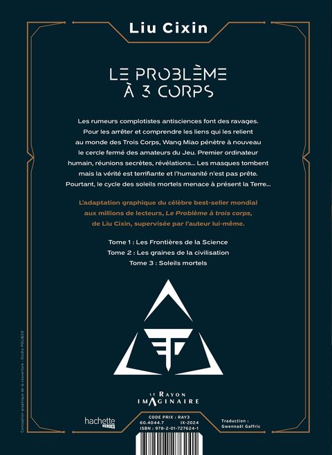 Les rumeurs complotistes antisciences font des ravages. Pour les arrêter et comprendre les liens qui les relient au monde des Trois Corps, Wang Miao pénètre à nouveau le cercle fermé des amateurs du Jeu. Premier ordinateur humain, réunions secrètes, révélations... Les masques tombent mais la vérité est terrifiante et l’humanité n’est pas prête. Pourtant, le cycle des soleils mortels menace à présent la Terre... L’adaptation graphique du célèbre best-seller mondial aux millions de lecteurs, Le Problème à trois corps, de Liu Cixin, supervisée par l’auteur lui-même.