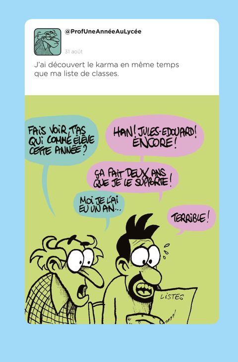 En 100 tweets et dessins un portrait des profs d’aujourd’hui de la rentrée scolaire aux grandes vacances en passant par le Bac. Le tout à travers la figure emblématique d’un prof d’histoire-géo, double de Fabrice Erre qui sait de quoi il parle car il est lui-même comme son héros prof.Une partie des dessins est parue sur son blog sur le site du Monde.