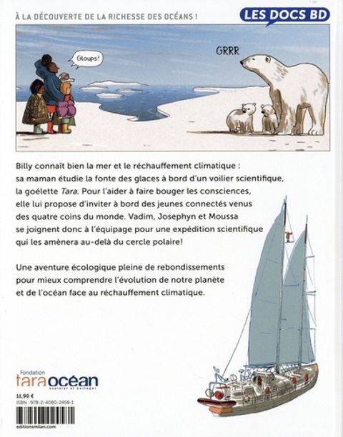 Billy, neuf ans, connaît bien la mer et les problématiques liées au réchauffement climatique : sa maman est capitaine de la goélette "Tara", un petit bateau qui lui sert à étudier les évolutions de la banquise et la fonte des glaces. Mais leur travail manque d'audience, et la situation empire année après année. Il est temps de faire bouger les consciences ! Et pour ça, rien de mieux que d'inviter des jeunes connectés pour venir les assister. C'est comme cela qu'embarquent le Sibérien Vadim, l'Ougandaise Josephyn et Moosa, venu des Maldives, trois adolescents qui vont suivre Billy et l'équipe, et communiquer auprès de leurs communautés. Aux côtés des scientifiques, ils vont découvrir les effets concrets de la pollution et les solutions à mettre en place pour la freiner, mais aussi rencontrer des populations autochtones et même se retrouver nez à nez avec un ours polaire : une vraie aventure écologique ! Un album consacré à une thématique tristement d'actualité et au centre des préoccupations des jeunes lecteurs, mais traitée ici avec nuance, réalisme et optimisme. Sous la plume de la scénariste Lucie Le Moine et le trait précis et poétique de Sylvain Dorange, les enfants et les scientifiques choisissent d'agir main dans la main, pour un monde meilleur demain ! Ce tome est relu et soutenu par la fondation Tara Océan, qui organise des expéditions pour comprendre et analyser l'impact du réchauffement climatique.