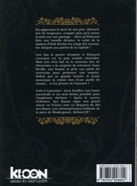 Dès sa naissance, Richard, héritier de la prestigieuse famille d'York, est un enfant maudit. Né hermaphrodite, il est rejeté et haï par une mère qui considère sa venue au monde comme une punition du ciel. Seule lueur d'espoir dans cette enfance tourmentée, la présence d'un père qui lui voue un amour inconditionnel. Mais la vie du jeune Richard bascule quand son père s'engage dans un conflit avec les Lancaster pour faire valoir ses droits au trône. De cette guerre des Deux-Roses va émerger un monstre politique, un tyran sanguinaire qui marquera de son empreinte l'histoire de l'Angleterre. York et Lancaster : deux familles, une haine ancestrale et un seul destin possible pour l'Angleterre déchirée ! Après le succès d'Otomen, Aya Kanno signe son grand retour en France avec Le Requiem du Roi des Roses, une réinterprétation brillante de la pièce de Shakespeare, Richard III !