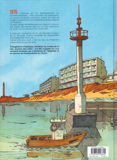 1976. Un projet immobilier ambitieux prévoit au bord de l'océan la construction d'un complexe touristique baptisé le Poséidon. Le petit village de Malberosse est destiné à devenir une station balnéaire de premier plan sur la côte atlantique. À quelques kilomètres de là, les derniers bunkers de la Seconde Guerre mondiale, léchés par l'océan, s'enfoncent inexorablement dans le sable... Trente ans plus tard, c'est au tour du Poséidon d'être menacé par les flots... Les auteurs proposent une histoire humaine qui nous interroge sur les changements climatiques d’aujourd’hui et nous sensibilise sur la montée des eaux face à l’urbanisation. Réchauffement climatique, élévation du niveau de la mer, érosion des côtes : une BD engagée sur une actualité brûlante... Un ouvrage publié en partenariat avec le Conservatoire du littoral.