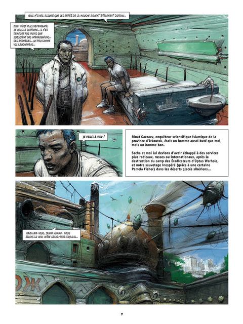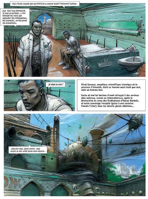 Nike ... Qu'une mini-bombe atomique explose alors à mes pieds, qu'un éclat de terrasse pulvérise mon nez (troisième fois en un an), tout, en ce fragment de temps à la violence extrême, aurait dû me mettre la puce à l'oreille (elle-même soufflée par la déflagration). Tout aurait mieux valu que l'invitation. Car c'est ici que tout recommence. Amir Je serrai très fort son corps et cette nouvelle peau anthracite tout droit sortie de mes cauchemars. Très fort et très longtemps. Comme pour tenter d'en conjurer l'extravagance. Leyla Nike resta autant de temps que les neuf autres dans la grotte. Comme les neuf autres, dès son retour, il demanda à l'huissier une feuille de papier et un crayon, et comme les neuf autres il se tut pendant de longues heures. Enfin, comme pour les neuf autres, sa première phrase fut une triple question, identique au mot près : « Le carbone 14 bis dit quoi sur les os et l'obus oe Les recoupements avec les éléments de l'inventeur disent quoi sur la grotte ensevelie oe Le 32 décembre c'est quand oe » La tétralogie du Monstre est une histoire à trois voix. Celles de Nike, Leyla et Amir, orphelins de Sarajevo aux quatre coins du monde. Il s'agit avant tout d'un travail sur la mémoire. Mémoire individuelle et collective, où se mêlent des images écrites de l'éclatement de la Yougoslavie, « lieu » de naissance d'Enki Bilal (pays à peine disloqué que déjà sorti des mémoires), et des images peintes d'une entêtante conjugaison passé-présent-futur. Mémoire prospective aussi, potentielle, élargie des Balkans au reste du monde, comme dans un miroir. Ce monde, seul endroit, il faut bien le dire, qui nous reste.