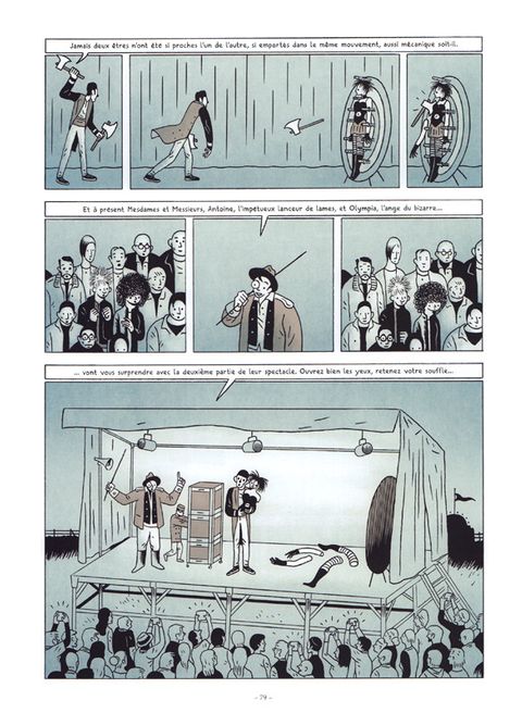 Les monstres fragiles et les rescapés des nuits rouges se sont trouvés un sanctuaire aux abords de la ville... Après Les monstres aux pieds d'argile et Les nuits rouges du théâtre d'épouvante, Alexandre Kha propose une nouvelle plongée dans son bestiaire fantastique, prenant cette fois-ci comme cadre une "foire aux freaks" . Olympia, femme-automate inventée par un certain Zacharius, en est une des attractions principales. Arthur Grisham, le bibliothécaire adepte du bizarre, y amène son ami Antoine. Antoine tentera de percer les secrets de l'automate au risque de tomber amoureux... Olympia est une version féminisée du fameux automate joueur d'échecs de Kempelen et Maelzel qui fascina l'Europe aux XVIIIe et XIXe siècles. Cette "Eve future" continue ici ses tournées loin des cours luxueuses, au milieu des losers, des chimères et des junkies du petit cirque. Entre les représentations, elle approfondit son exploration de l'humanité et son libre-arbitre, interrogeant les sentiments et l'identité du pauvre Antoine. Entrecoupant le récit principal d'intermèdes en ombres chinoises narrant le passé d'Olympia, ce conte nous fait naviguer dans un jeu de citations luxuriant, éclectique comme un cabinet de curiosités, les sources d'Alexandre Kha se trouvant aussi bien dans la pop culture (il réanime pour l'occasion le duo Iggy Pop-David Bowie) que dans la littérature fantastique du XIXe d'E. T. A. Hoffmann ou de Jules Verne, en passant par la science-fiction de Philip K. Dick.