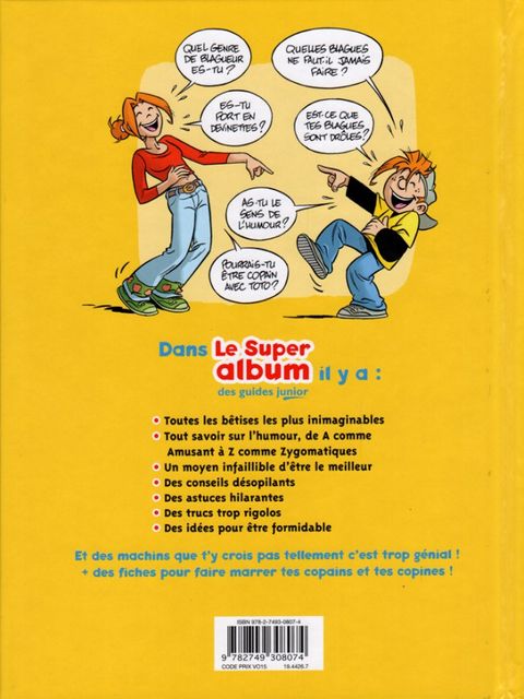 Quand on est jeune, il y deux choses qu'on adore faire : rigoler et faire des bêtises ! Mais ce genre de « légèreté » nécessite parfois une vraie discipline et de l'application. C'est pourquoi depuis plusieurs années, les Guides Junior proposent aux plus jeunes d'astucieux conseils en BD - dans la même formule que les Guides en BD pour leurs parents - pour devenir des as en la matière. Ce nouveau recueil, intitulé le Super Album des Guides Junior vous explique sur près de 150 pages comment réaliser les bêtises les plus folles, devenir un pro de la rigolade ou atteindre le rang de super génial. Autant dire un ouvrage indispensable pour être la future star de la cour de récré !