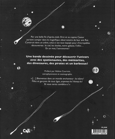 Une BD pour les curieux d'astronomie, à lire à partir de 8 ans ! Par une belle fin d'après-midi, Orni, Castor et Rat partent camper pour le week-end. Une surprise les attend : leur copain Rat les héberge dans son observatoire construit dans un arbre. La cabane est magnifique et toute équipée pour d'incroyables découvertes : le ciel, les étoiles, notre galaxie, l'infini... En un mot, l'astronomie ! Qu'il s'agisse de comprendre la différence entre météorites, comètes et astéroïdes à partir d'un caillou, de découvrir les lumières, visibles et invisibles, à l'occasion de l'apparition d'un arc-en-ciel ou encore d'apprendre comment trouver l'étoile polaire en jouant au pirate... Tout est prétexte à s'interroger pour mieux comprendre notre univers.