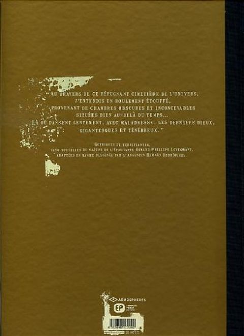 "" Au travers de ce répugnant cimetière de l'univers, j'entendis un roulement étouffé, provenant de chambres obscures et inconcevables situées bien au-delà du temps... Là où dansent lentement, avec maladresse, les derniers dieux, gigantesques et ténébreux. "" Gothiques et terrifiantes, cinq nouvelles du maître de l'épouvante Howard Phillips Lovecraft, adaptées en bande dessinée par l'argentin Hernan Rodriguez.