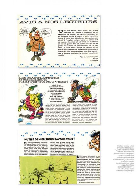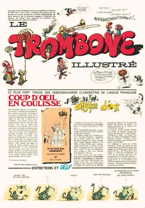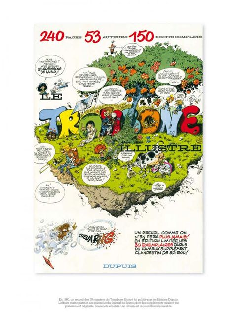 1978, un souffle de liberté souffle sur le ronronnant Journal de SPIROU : un supplément de huit pages réalisé clandestinement dans les caves des Éditions Dupuis et encarté dans le journal. Un esprit frondeur, un humour plus adulte, des auteurs en vogue sous la houlette de Franquin et Delporte Gotlib, Alexis, Roba, Hausman, Dany, Rosinski, Jannin... Trente numéros furent publiés, trente numéros qui marquèrent à jamais la bande dessinée franco-belge. Dupuis publia en 1980 un recueil devenu mythique, car rare et introuvable. Il était temps de le republier, dans une édition augmentée d'un Trombone inédit, réalisé par l'équipe du Trombone pour l'anniversaire d'Yvan Delporte.