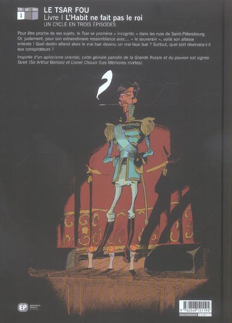 Pour être proche de ses nombreux sujets, le Tsar se promène dans les rues, habillé en saltimbanque... Catastrophe ! Son altesse est enlevée par un groupe de conspirateurs qui décide d'exploiter son extraordinaire ressemblance avec le souverain ! Bien sûr, " le vrai Tsar " accepte leur idée folle : se faire passer pour... le Tsar !Mais quel châtiment réserve ensuite le tsar aux conspirateurs ? Une géniale parodie de la grande Russie et de l'exercice du pouvoir signée : Tarek (Sir Arthur Benton) et Lionel Chouin (Les mémoires mortes).\0