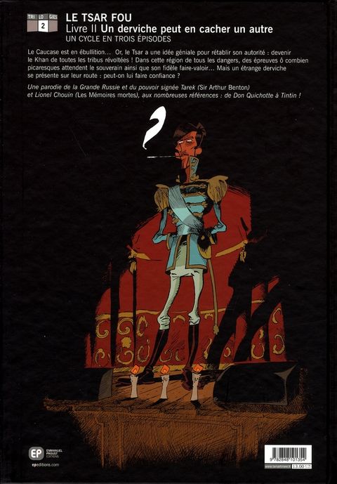 le caucase est en ébullition. or, le tsar a une idée géniale pour rétablir son autorité : devenir le khan de toutes les tribus révoltées ! dans cette région de tous les dangers, des épreuves ô combien picaresques attendent le souverain ainsi que son fidèle faire-valoir. mais un étrange derviche se présente sur leur route : peut-on lui faire confiance ? une parodie de la grande russie et du pouvoir signée tarek (sir arthur benton) et lionel chouin (les mémoires mortes), aux nombreuses références : de don quichotte à tintin !.