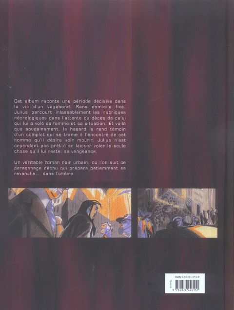 « Le Vagabond » inaugure la collection URBAINE, dont l'objectif est d'offrir à terme des portraits de villes et de vies citadines différentes du monde entier. Composée de one-shots, la collection s'adresse aux amateurs de graphismes dits « d'auteur » et de récits de vie forts. Ce premier album raconte une période décisive dans la vie d'un vagabond. Sans domicile fixe, Julius parcourt inlassablement les rubriques nécrologiques dans l'attente du décès de celui qui lui a volé sa femme et sa situation. Et voilà que soudainement, le hasard le rend témoin d'un complot qui se trame à l'encontre de cet homme qu'il désire voir mourir. Julius n'est cependant pas prêt à se laisser voler la seule chose qu'il lui reste : sa vengeance. Un véritable roman noir urbain, où l'on suit ce personnage déchu qui prépare patiemment sa revanche... dans l'ombre.