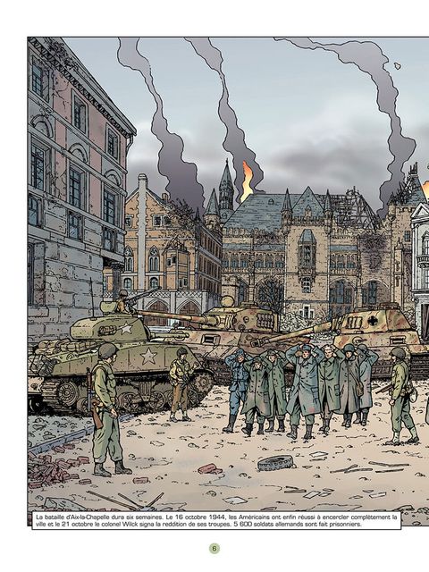 Après Le Mur de l'Atlantique publié en 2011 puis Le Débarquement il y a quelques mois, la série des Reportages de Lefranc consacrée à quelques-uns des événements majeurs de la Seconde Guerre mondiale en Europe se poursuit sur le même principe - une exploration documentaire approfondie grâce à la combinaison du dessin, du texte et de la photographie - avec un autre moment essentiel de la fin du conflit : La Bataille des Ardennes. Événement capital, parce qu'il marque l'ultime sursaut militaire du Reich face à l'avancée des troupes alliées qui foncent vers l'Allemagne, et qu'il réussit à donner brièvement l'impression de pouvoir renverser le cours de la guerre, cet épisode décisif est ici relaté dans tous les détails de sa chronologie. Spécialiste de l'histoire de la Seconde Guerre mondiale, Isabelle Bournier (directrice culturelle et pédagogique au Mémorial de Caen) livre avec précision l'enchainement des faits, depuis le déclenchement de l'offensive allemande dans la nuit du 15 au 16 décembre 1944 jusqu'au reflux à partir de la mi-janvier 1945, en passant par les épisodes tragiques du massacre de Malmédy ou du siège de Bastogne. Adossés à une solide documentation, Olivier Weinberg et Alain Maury illustrent avec beaucoup d'efficacité quelques-unes des séquences clés de cet épisode terminal du conflit. En fin de volume, diverses rubriques thématiques illustrées (véhicules, chars et blindés, uniformes, etc.) apportent un contrepoint utile à cet ensemble d'une grande richesse.