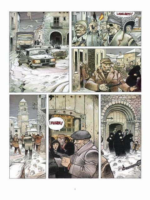 Par une nuit d’hiver en Espagne, sur les hauts plateaux de la province de l’Aragon, une expédition punitive s’abat sur le petit village de Nieves. Tous ses habitants, y compris les femmes et les enfants, sont exécutés et le village est incendié. L’attentat est revendiqué par un groupe politique, les Phalanges de l’Ordre Noir, au nom des « valeurs de l’Occident chrétien ». Le village, haut lieu des affrontements entre républicains et franquistes à la fin des années trente lors de la guerre d’Espagne, venait de voter massivement à gauche lors des dernières élections… Convaincus que ce massacre signe le retour de l’extrême droite qu’ils ont autrefois combattue, un groupe d’anciens des brigades internationales, quarante ans après, se décide à reprendre les armes. De l’Espagne à Suisse en passant par l’Italie, les Pays-Bas et la France, une dizaine d’hommes que l’âge a rendus las, mais toujours fidèles à leurs convictions de jeunesse, vont ainsi donner la chasse à leurs vieux ennemis, jusqu’à l’affrontement final. Initialement publié en 1979, Les Phalanges de l’Ordre Noir est une méditation désenchantée sur la fraternité, le temps qui passe et la vanité des idéaux. Avec ce brillant récit, Bilal et Christin inaugurent la veine des thrillers politiques qu’ils approfondiront un peu plus tard avec Partie de chasse