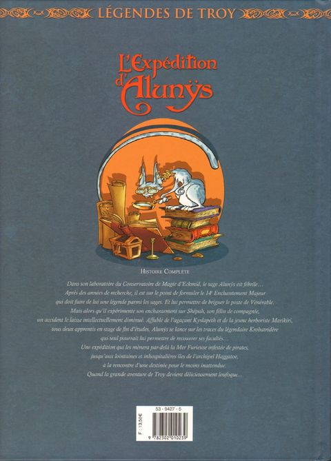Dans son laboratoire du Conservatoire de Magie d'Eckmül, le sage Alunÿs est fébrile. Après des années de recherche. Il est sur le point de formuler le 14e Enchantement Majeur qui doit faire de lui une légende parmi les sages et lui permettre de briguer le poste de Vénérable. Mais alors qu'il expérimente son enchantement sur Shepäh, son félin de compagnie, un accident le laisse intellectuellement diminué. Affublé de l'agaçant Kyslapeth et de la jeune herboriste Marikiri, tous deux apprentis et en stage de fi n d'études, Alunÿs se lance sur les traces du légendaire Krobatridère, le seul qui pourrait lui permettre de recouvrer ses facultés... Une expédition qui les mènera par-delà la mer Furieuse infestée de pirates, jusqu'aux lointaines et inhospitalières îles de l'archipel Haggatoe, à la rencontre d'une destinée pour le moins inattendue. Quand la grande aventure de Troy devient délicieusement loufoque...