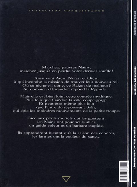 Marchez, pauvres Nains, marchez jusqu'à en perdre votre dernier souffle ! Ainsi vont Aren, Noren et Oten, chargés de trouver leur nouveau roi. Où se niche-t-il donc, ce Raken de malheur ? Au domaine d'Ewandor, répond la légende... Mais elle est bien loin, cette contrée mythique. Face aux périls mortels qui les guettent, les Nains ont pour seuls alliés un guide voleur et un barbare stupide. Ils apprendront bientôt qu'à la Saison des Cendres, les larmes ont la couleur du sang...
