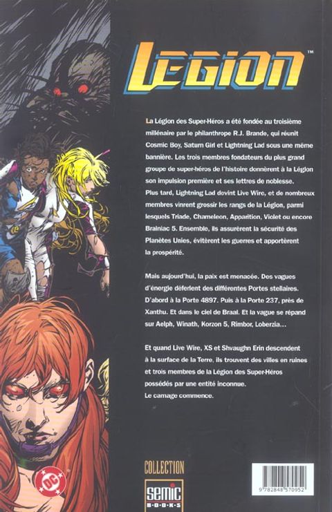La Légion des Super-Héros a été fondée au troisième millénaire par le philanthrope R.J. Brande, qui réunit Cosmic Boy, Saturn Girl et Lightning Lad sous une même bannière. Les trois membres fondateurs du plus grand groupe de super-héros de l'histoire donnèrent à la Légion son impulsion première et ses lettres de noblesse. Plus tard, Lightning Lad devint Live Wire, et de nombreux membres vinrent grossir les rangs de la Légion, parmi lesquels Triade, Chameleon, Apparition, Violet ou encore Brainiac 5. Ensemble, ils assurèrent la sécurité des Planètes Unies évitèrent les guerres et apportèrent la prospérité. Mais aujourd'hui, la paix est menacée. Des vagues d'énergie déferlent des différentes Portes stellaires. D'abord à la Porte 4897. Puis à la Porte 237, près de Xanthu. Et dans le ciel de Braal. Et la vague se répand sur Aelph, Winath, Korzon 5, Rimbor, Loberzia... Et quand Live Wire, XS et Shvaughn Erin descendent à la surface de la Terre, ils trouvent des villes en ruines et trois membres de la Légion des Super-Héros possédés par une entité inconnue. Le carnage commence.