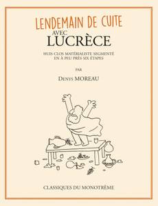 Ainsi s'ouvre le nouveau livre de Denys Moreau : un matin au réveil, une partie de la soirée précédente échappe à la mémoire du narrateur. Il est assailli par de terribles symptômes touchant aussi bien au corps qu'à l'esprit. dans son lit se trouve... Lucrèce. enfin métonymiquement, puisque c'est le texte De la nature des choses qui partage ses draps. Vous l'avez compris, notre conteur a la gueule de bois, confirmant ainsi le titre : Lendemain de cuite avec Lucrèce. Il nous emmène naviguer dans le texte philosophique (avec des vrais morceaux de Lucrèce dedans), slalomant entre les affres de son indisposition, et menant une enquête digne d'un épisode du commissaire Maigret. Si le suspense qui tend l'intrigue préserve entièrement le mystère, la chute relève d'une logique implacable.