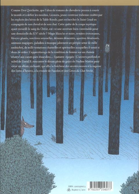 Comme Don Quichotte, que l'abus de romans de chevalerie poussa à courir le monde et à défier les moulins, Leonora comtesse italienne exaltée par les exploits des héros de la Table Ronde, part rechercher le Saint Graal en compagnie de son cheval et de son chat. Cette quête de la coupe mystique ayant recueilli le sang du Christ, est-ce une aventure bien convenable pour une demoiselle du XIVe siècle ? Magie blanche et noire, ermites érotomanes, féroces géants, sorcières sensuelles, démons démontés, spectres désabusés, animaux magiques, paladins à musique jalonnent un périple semé de mille embûches, de mille tentations charnelles et spirituelles auxquelles il serait si doux de céder. L'apprentissage de la condition de femme sur un chemin réservé aux coeurs purs masculins... Epatante épopée ! L'univers profond et subtil de David B. rencontre le dessin plein de grâce de Pauline Martin pour créer un album enchanté, qui allie la fraîcheur des oeuvres neuves à la sagesse des livres d'heures, à la croisée de Pasolini et des Contes du Chat Perché.