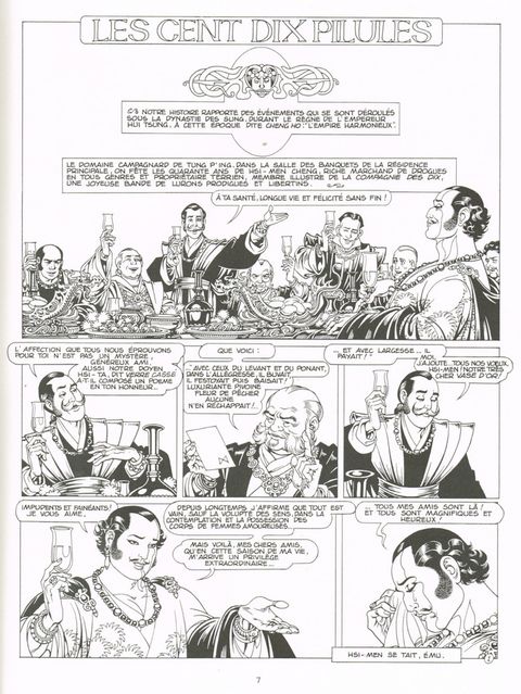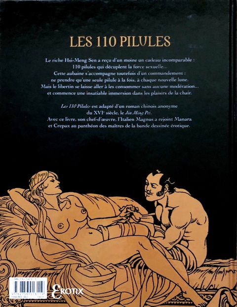 Un dessin en noir et blanc soigné et réaliste de Magnus. Franchement pornographique dans la première partie, le récit devient plus sombre et torturé vers la fin. BDM : "Un sommet de l érotisme prépublié dans L Écho des Savanes à partir de 1986" Jin Ping Mei est un monument de la littérature érotique chinoise. Longtemps considéré comme le premier livre pornographe, le roman a subit de multiples nettoyages au fils des années. Les éditions qui circulent sur le marché actuellement sont des versions "épurées". On croit que la version originale est gardé sous clé dans la bibliothèque nationale chinoise. Les 110 pilules n'est qu'une adaption très libre du roman. il existe une réédition rapide de l'EO avec 1er et 4e plat identique mais avec un DL 05/1986 et AI 05/1986