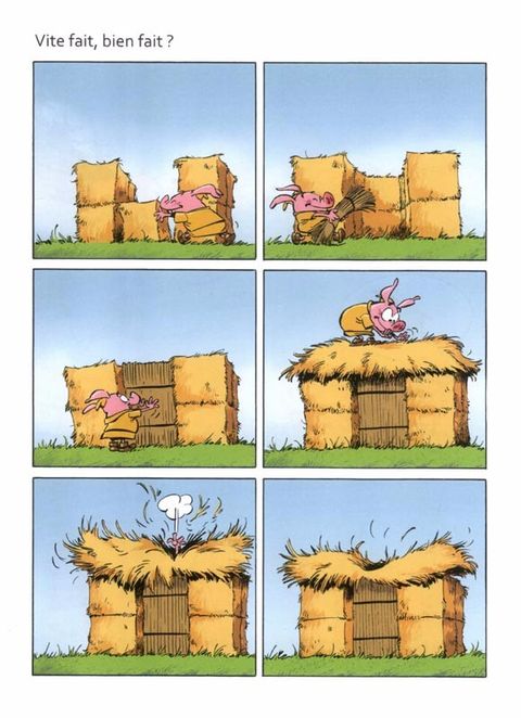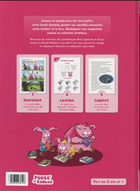 Les trois petits cochons se construisent une maison, une de paille, une de bois et une troisième de brique que le loup tente de détruire... Raconté dans une BD sans texte, le conte est suivi de sa version texte et d'un atelier pour apprendre à dessiner les personnages.