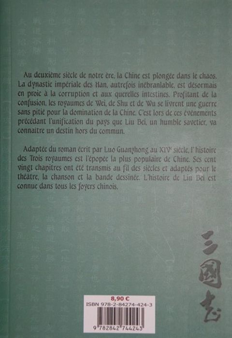 Au deuxième siècle de notre ère, la Chine est plongée dans le chaos. La dynastie impériale des Plan, autrefois inébranlable, est désormais en proie à la corruption et aux querelles intestines. Profitant de la confusion, les royaumes de Wei, de Shu et de Wu se livrent une guerre sans pitié pour la domination de la Chine. C'est lors de ces événements précédant l'unification du pays que Liu Ni, un humble savetier, va connaître un destin hors du commun. Adaptée du roman écrit par Luo GuanMong au X1Vz siècle, 1' histoire des Trois royaumes est l'épopée la plus populaire de Chine. Ses cent vingt chapitres ont été transmis au fil des siècles et adaptés pour le théâtre, la chanson et la bande dessinée. L'histoire de Liu Bel est connue dans tous les foyers chinois.