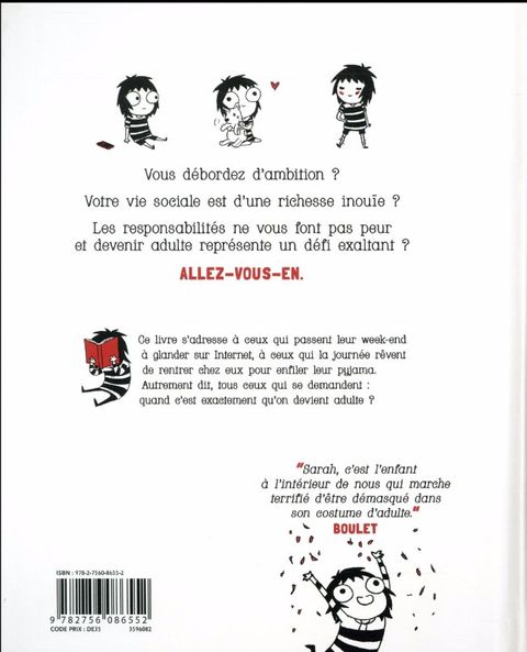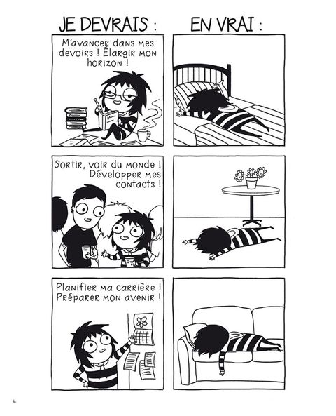 A travers son personnage caustique, mignon et drôle, Sarah croque avec beaucoup de mordant les petits et grands tracas de sa vie. Ses flemmes, ses envies, son travail, sa touchante misanthropie ou encore ses truculentes pensées existentielles. Autrement dit, les difficultés de beaucoup de jeunes adultes d'aujourd'hui ! Une apparente légèreté pour des réflexions toujours en plein dans le mille.