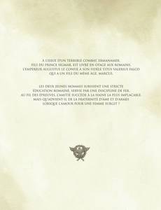 Marcus Valerius Falco et Ermanamer ont connu le même entraînement, soumis à une discipline de fer. Au fil des épreuves, les deux jeunes gens commencent par s'affronter et finissent par s'estimer au point de devenir amis. Ils découvrent l'ivresse des armes et le plaisir des sens. Au terme d'une chasse périlleuse, le Romain et le barbare mêlent leur sang pour sceller un pacte de fraternité éternelle. Avec cette nouvelle série sous forme de récit initiatique, Marini se trouve seul aux commandes, à la fois pour le dessin et le scénario. A travers les destinées des deux jeunes gens, l'auteur campe tous les paradoxes d'un monde romain au tournant d'une ère nouvelle, tiraillé entre ses sources latines, souvent corrompues par la volupté, l'ambition et les intrigues, et la vitalité sauvage des peuplades germaniques...